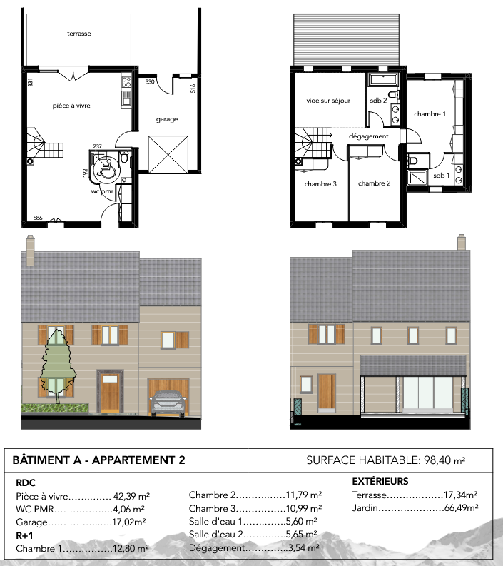 Le lot A2 est un 3 pièces Duplex de 98,40 m² hab., offrant une distribution fonctionnelle et de beaux volumes. L’espace de vie s’ouvre sur une terrasse de 14.34 m² prolongée par un jardin privatif de 66,49 m², idéal pour profiter du calme ambiant et des vues pyrénéennes.