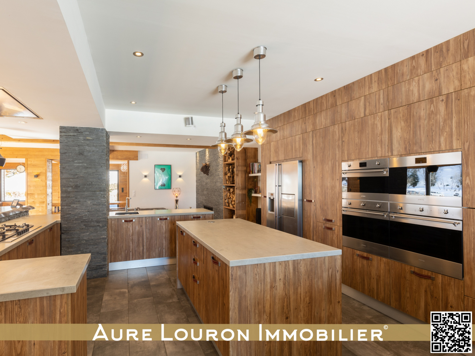 Au premier étage, un espace de vie EXCEPTIONNEL de plus de 120 m² baigné de lumière grâce à ses baies vitrées et son balcon ceinturant trois côtés du chalet, comprenant une cuisine sur-mesure entièrement équipée (plan en céramique, électroménager encastré etc.), un salon chaleureux / cosy avec cheminée et un espace salle à manger idéal pour recevoir.